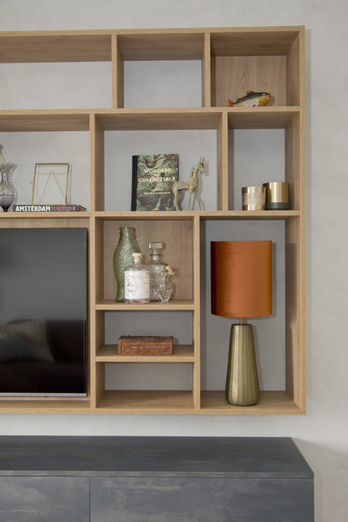 Met een paar ingrijpen en wat schuiven met de bestaande meubels is het een fijne gezinswoning geworden. De maatkast in de woonkamer met geïntegreerde TV werd de spil van de woonkamer en tevens een persoonlijk inkijkje in het leven door de familiestukken en foto’s.